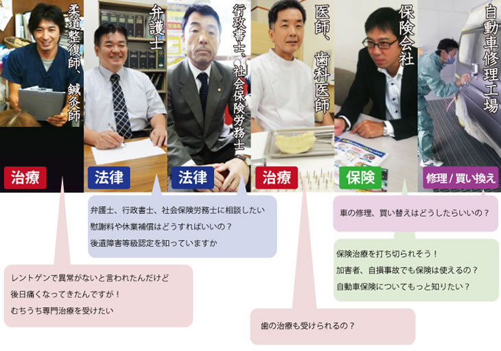 交通事故と労災に関することなら治療、賠償、修理、保険と全てにお応えする全国組織です。